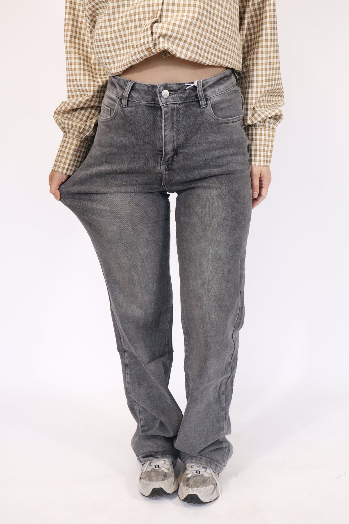 De broek heeft een highwaist taille met een wijdere broekspijp met veel stretch.