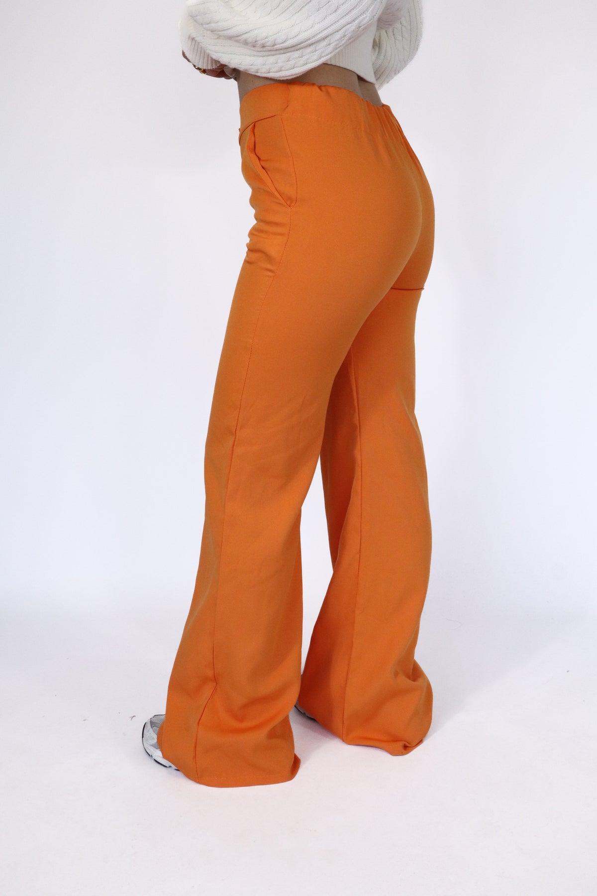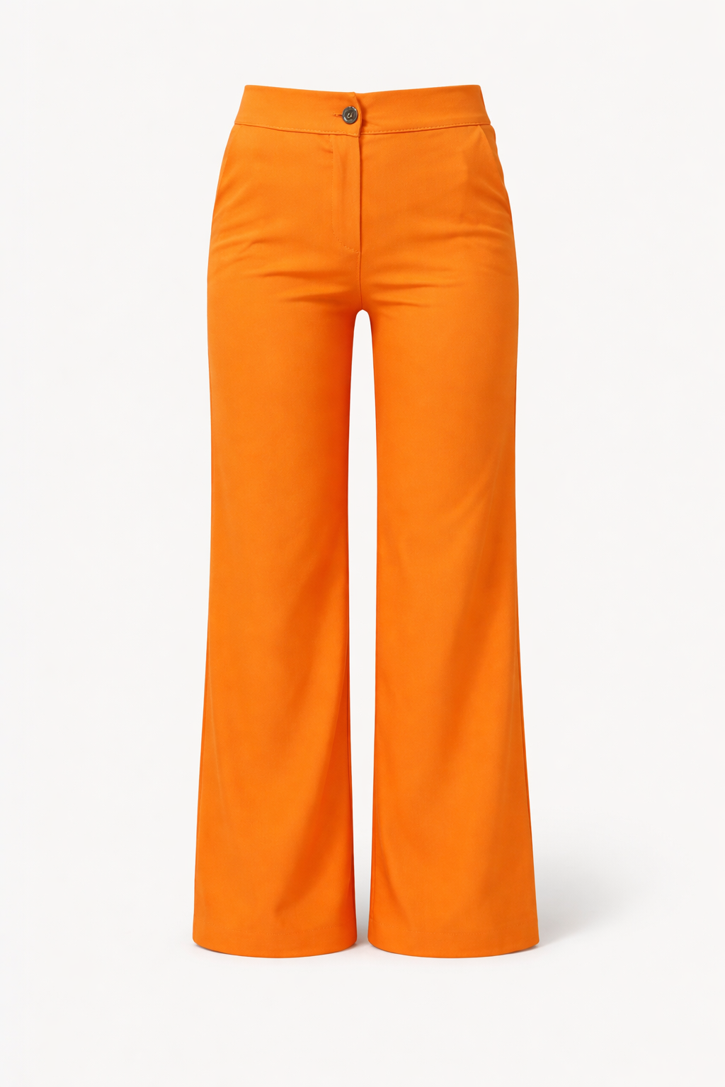 Oranje broek met een hoge taille en wijde pijpen. De broek heeft een knoop en ritssluiting aan de voorkant en is gemaakt van een gladde stof.