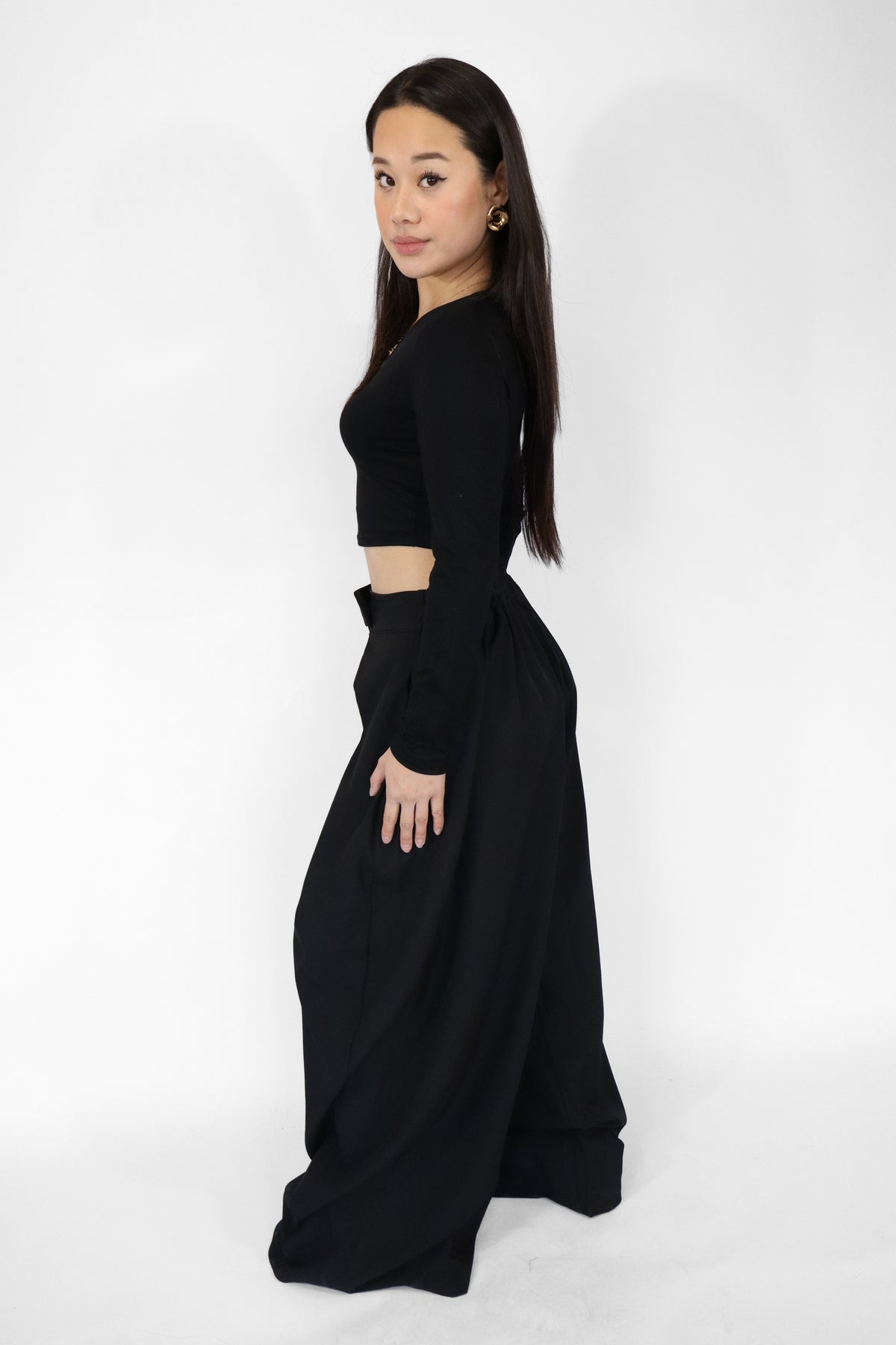 Deze stijlvolle broek heeft een wijde pasvorm en valt soepel langs de benen. De hoge taille en plooien aan de voorkant zorgen voor een elegante uitstraling. De broek heeft een knoopjes sluiting en zakken met een elastieken stretch.