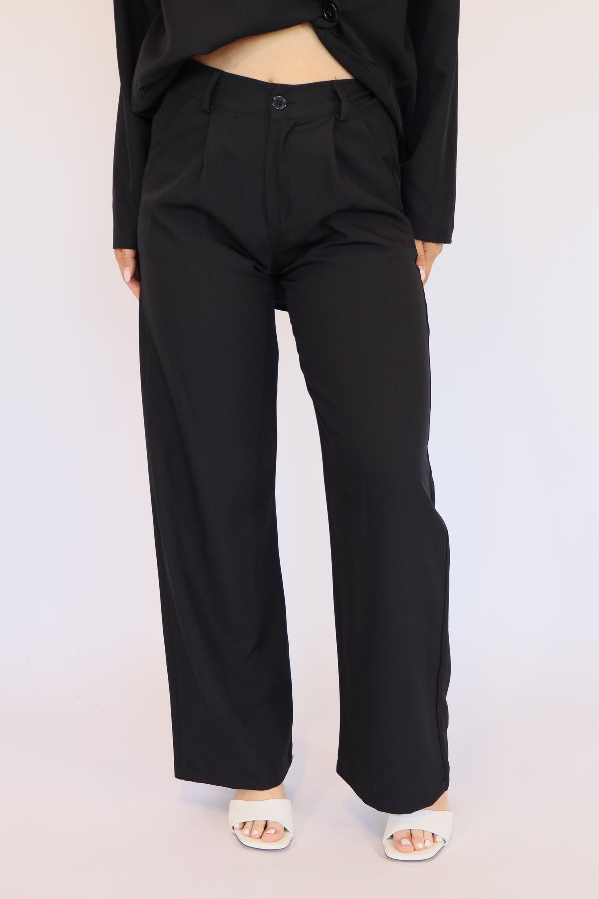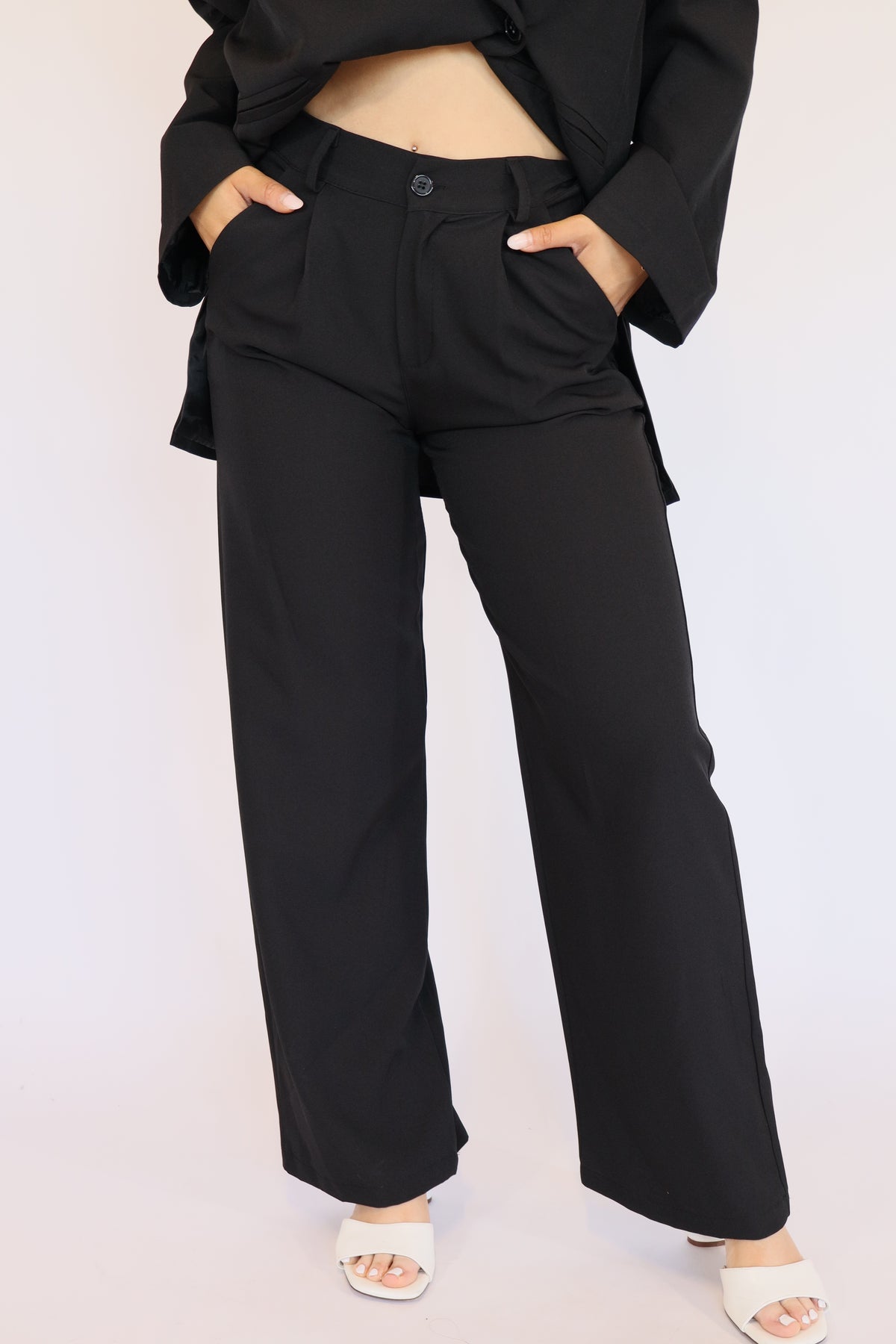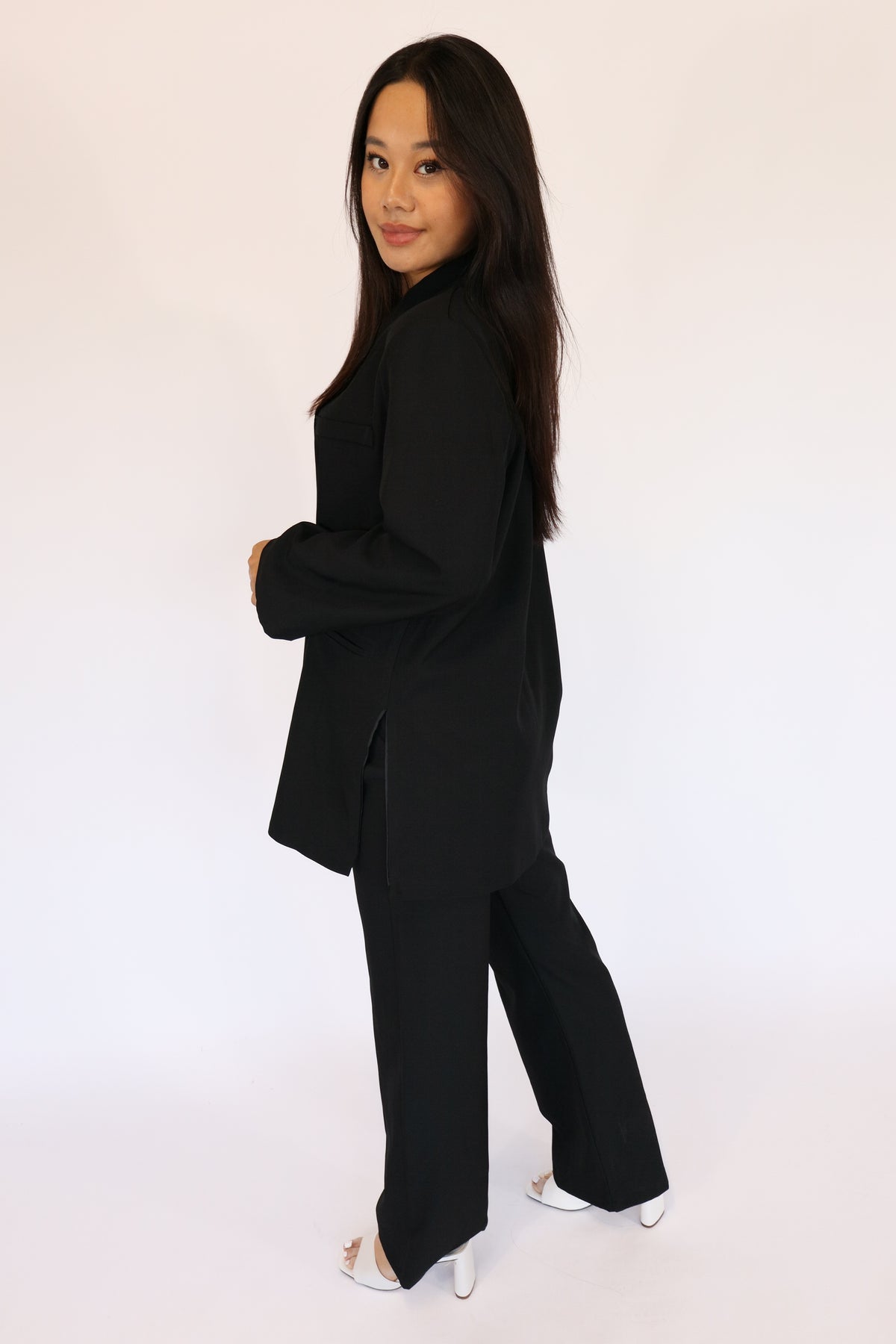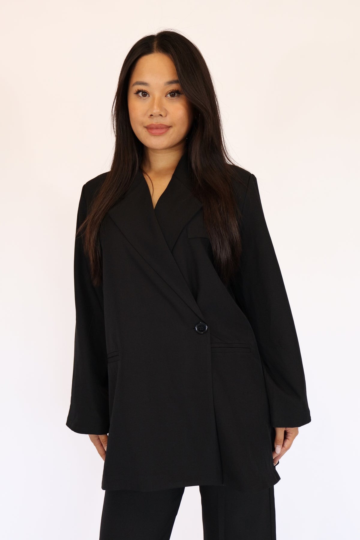 Deze blazer set heeft een bijpassende blazer met een pantalon, de pantalon heeft een lichte rek met zakken. De blazer heeft een oversized look met een schuine knoop.